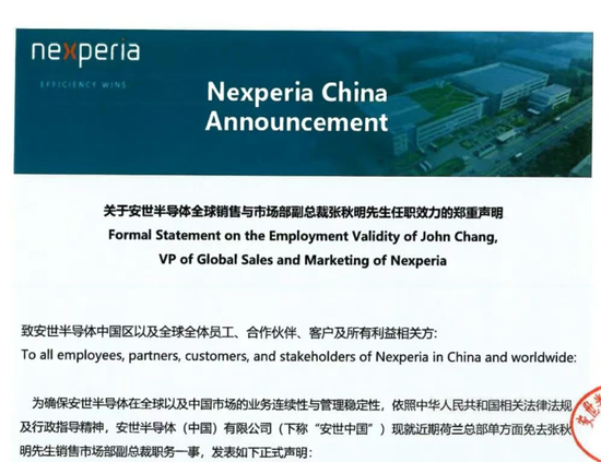 公司表示,为确保安世半导体在全球以及中国市场的业务连续性与管理稳定性,依照中华人民共和国相关法律法规及行政指导精神,安世半导体(中国)有限公司(下称“安世中国”)现就近期荷兰总部单方面免去张秋明先生销售市场部副总裁职务一事,发表如下正式声明: